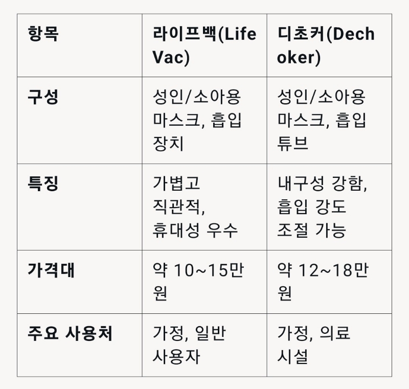 하임리히법 키트는 주로 흡입형 장치로, 성인과 어린이 모두 사용할 수 있도록 설계된 제품이 많아요. 대표적으로 라이프백(LifeVac)과 디초커(Dechoker)가 있는데, 두 제품 모두 기도 폐쇄 상황에서 이물질을 흡입해 제거하는 원리로 작동해요. 하지만 디자인, 사용감, 가격에서 약간의 차이가 있죠.
