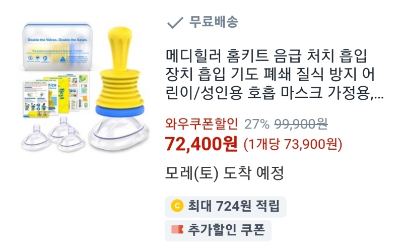 쿠팡에서 검색한 결과, 하임리히법 키트 중 라이프백(LifeVac) 기도 폐쇄 응급 키트 스타일 제품을 추천드립니다. 이 제품은 쿠팡에서 구매 가능하며, 사용 편의성과 신뢰도로 많은 사랑을 받고 있어요. 아래는 추천 이유와 구매 링크입니다.